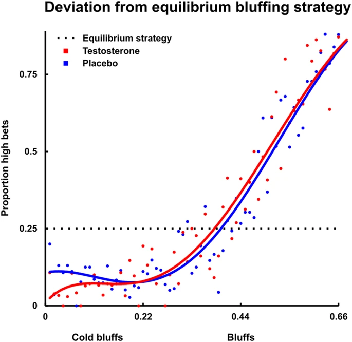 Here we show that testosterone administration in this game of bluff poker significantly reduces random bluffing, as well as cold bluffing, while significantly increasing calling. Our data suggest that testosterone in humans primarily motivates for reputable-status seeking, even when this elicits behaviors that are economically disadvantageous.