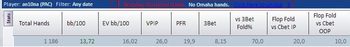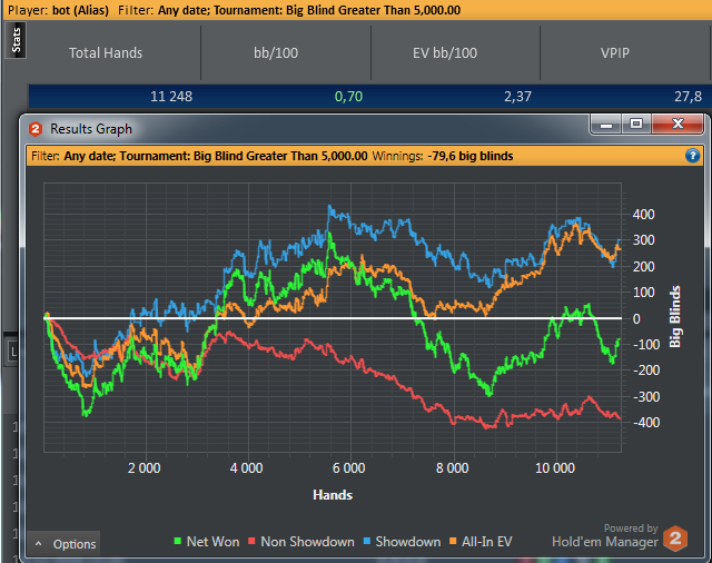 Играет с стандартным набором: онли минрейзы префлоп, мутный постфлоп, высокий WWSF, низкий Fold vs Cbet, глюки бота на префлопе.