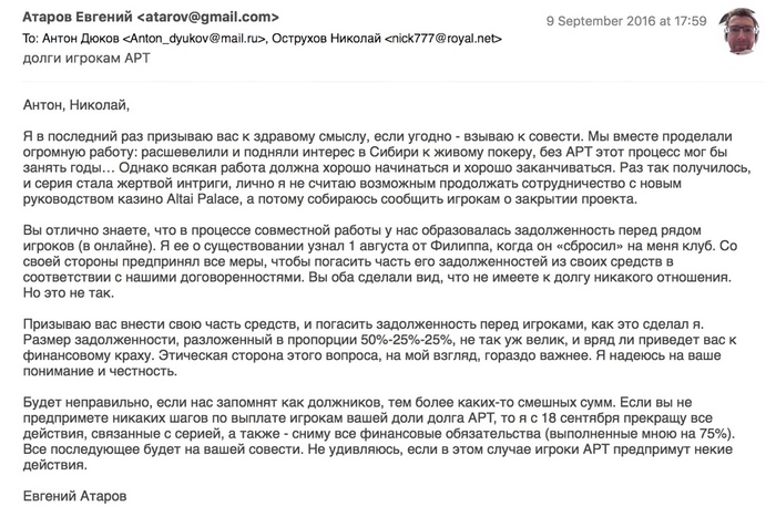 Я не перед кем не оправдываюсь, т.к. выполняю взятые на себя обязательства. Я лишь объясняю как возникла та или иная ситуация. Меня поражает, что мои траты и закрывание финансовых "дыр" всеми воспринимается как само собой разумеющееся, каждый шаг Антона или кого-то другого как подвиг и акт спасения APT. Я считал, что ЦЕЛЬ, т.е. настоящая большая покерная серия в Сибири ВАЖНЕЕ временных потерь и все должно вернуться... Выяснилось, что не вернется. Причем, произошло это, как все отлично знают, в довольно циничной, мерзкой форме. Да и сейчас, Сереж, судя по твоему посту, выясняется, что виноват во всем один я.