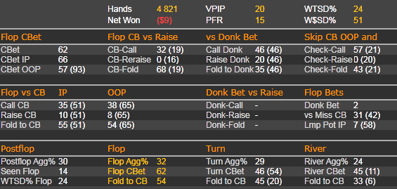 BB: $15.80 - VPIP: 23, PFR: 17, 3B: 8, AF: 3,0, Hands: 30088CO: $1.55 - VPIP: 45, PFR: 16, 3B: 11, AF: 1,8, Hands: 1053