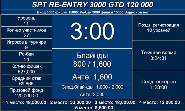 5 место 6000 - Мирошниченко Николай 4 место 7500 - Колосов Дмитрий 3 место 11000 - Бабиченко Петр Вдвоем поделили по 26000 Зольников Артем и Ильина Виктория