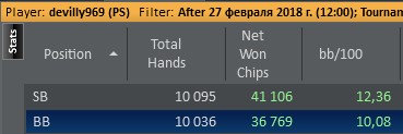 3 лимит. Не думал, что придётся на него вернуться. Но, видимо, я на каждом из лимитов обречён долбить по 10к турниров, прежде чем переходить на новый :D Хоть и по деньгам ТАКОЕ, но по ЕВ и качеству - в целом на 4 с плюсом. Разбрасывание фишками потому что по-прежнему присутствует, пусть и в ГОРАЗДО меньшей мере.