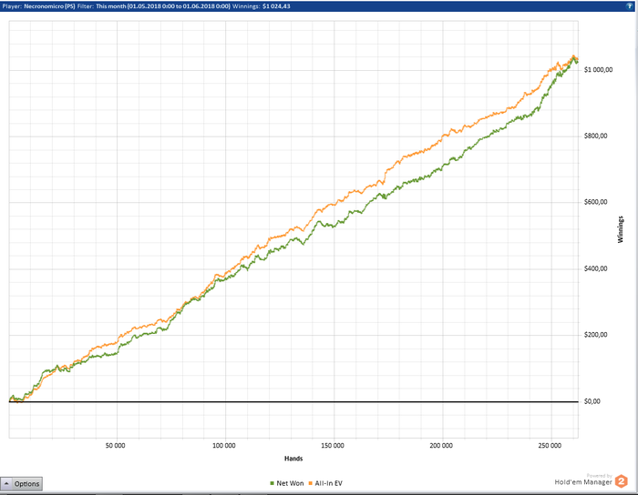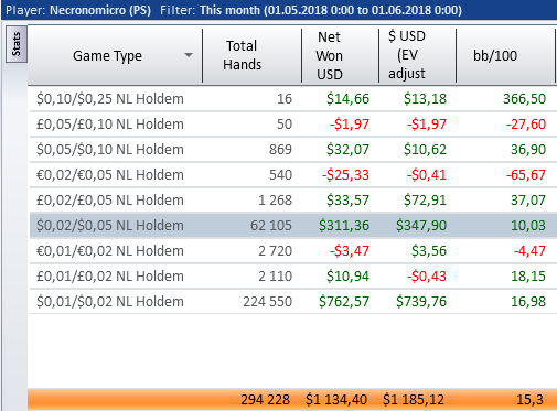 Такс,пора закрывать месяц. на покер в мае потратил 165 часов на игру откатав 300+К рук с профитом 1201$ и 20 часа на работу вне столов.Успешно втащил топ 1 в барельлиге и при этом еще было куча времени на пинание хуёв на дела вне игры что радует.