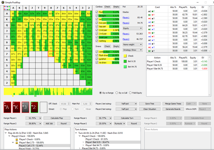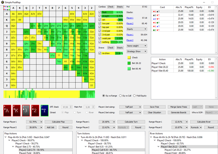 Если он перефолживает на ривере, то плюс соотв. будет больше Чтобы играть оптимально, он тогда должен будет коллировать все комбинации A4o и A5o.. Т.е. получается, что солвер — телефон?) (и агро-обезьяна заодно)