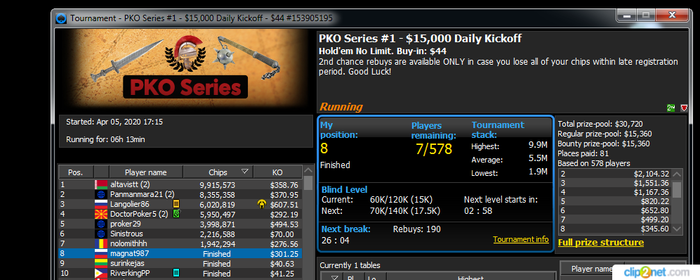 В турнирах с третьими местами в какой-то момент в топ три был чипаком с запасом, но все выставления проиграл. На финалке где топ 8 занял - вышел меньше 10бб на финалку и проиграл QQ в А7с.
