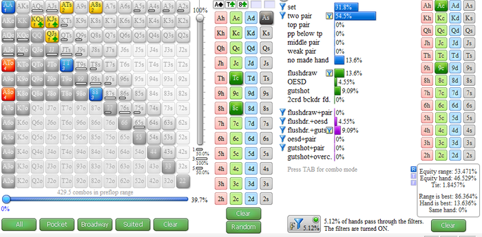 2) Рег. Не любит сбрасывать на 3беты и постфлоп. Если представить, что он протянет тёрном часть девяток и средних пар вроде десяток - валетов, возможно, я и наскребу ФЭ ривером, тем не менее, не лучшая ситуация для блефа, так как большую часть его диапазона должны составлять именно фд, к тому же, спарка добавляет соблазна тем же валетам с бубной проверить шд.