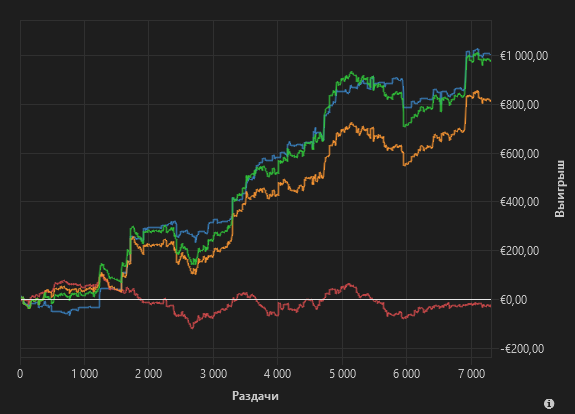 Nicedaybro, если БР крепкий, то не смотри результаты по дням и даже неделям, проще психологически будет, но не сразу, а когда привыкнешь. Когда смотрю резалты за месяц и там видно просадки — за пару дней изи можно улететь на косарь-полтора играя 50+100, что уж говорить про лимиты повыше.