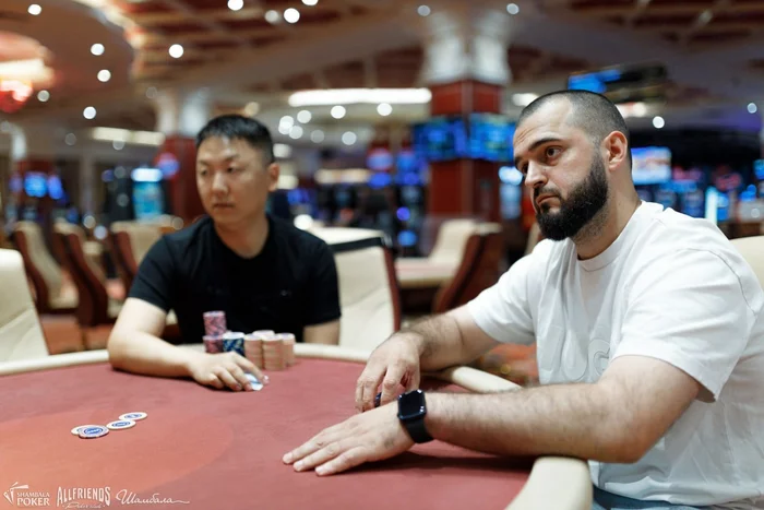 Черепов Александр открылся 600К, Ким Сергей выдвинул все фишки ~ 24ВВ с . Александр с отбил.