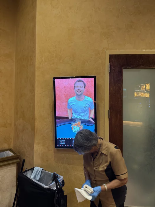 Вчера играл любимый турнир в Coconut Creek — нокаут по $200 с гарантией $10,000. Оставалось 18 человек, перерыв 10 минут на чип-ап, у меня было 1,012,000 фишек при среднем 244k. Решил сфоткать стек и уйти на перерыв. Возвращаюсь — у нас 740k, и игра уже началась. Говорю дилеру об ошибке, он зовёт турнирного директора — Дэйва.