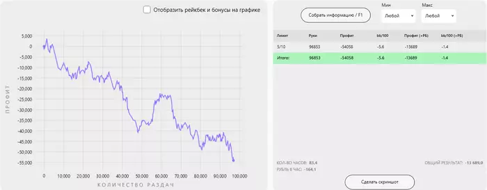 За 10к рук 85$ рейка, игра то есть, то нет.