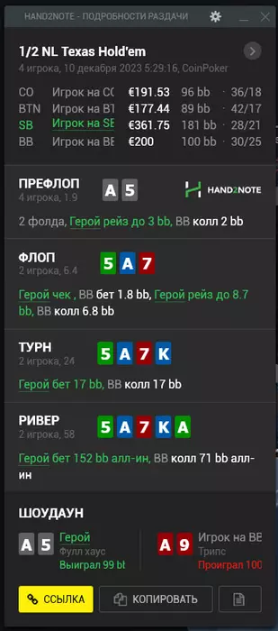 Только что, рег сыграл в 200бб+ 4бет с УТГ в меня 37бб и колл АИ с QQ. Офк я не выиграл с тузами, слишком сложно. Это реги мидстейкс приложух такую игру показывают.