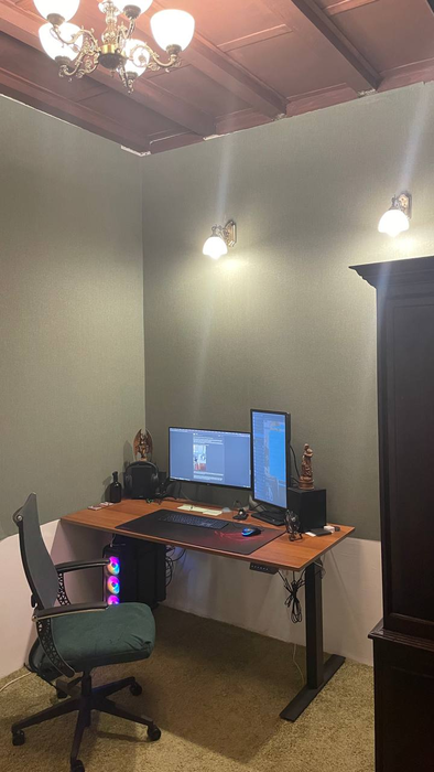 Осталось поменять столешницу, ну там целый проект по столу в голове есть. Добавить полку на стол, огромную полку слева от стола на стену, обшить всю нижнюю белую часть стен деревом, подшить стык потолка со стеной, ну и диван купить: