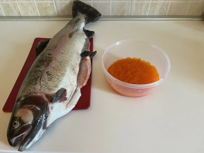 Первый раз заказали тут свежую форель (вылавливают утром и развозят по городам), рыба 3,6 кг., вес икры не знаю, граммов 300 точно есть, может и больше