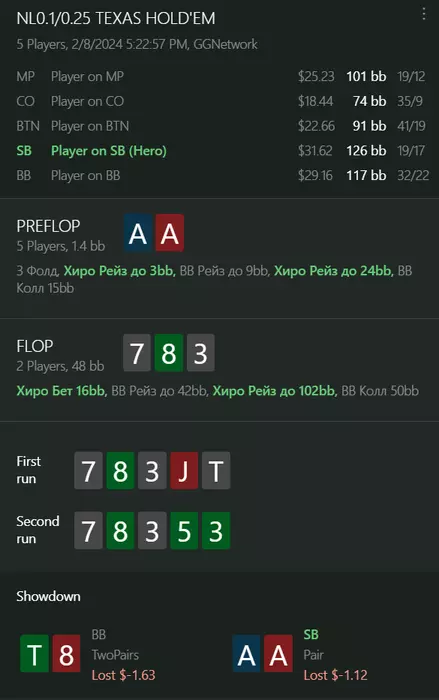 С T9s ошибка на префлопе (нужно было рейзить), но на результат это не повлияло бы 😅
