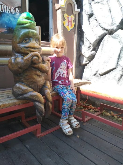 Закончилось представление и началась вторая часть пытки - экспозиция. Соня не хотела ехать на папе, но и пешком ее отпускать было такое себе - она приставала к людям, пыталась залезть туда, куда нельзя, трогала экспонаты и рвала цветы. В общем вела себя, как настоящая обезьянка Анфиса из книги Успенского. И только я знала, как взять ее так, чтобы она не вырывалась, а ехала на родителе. Примерно час я таскала на себе 10 кг ребенка.