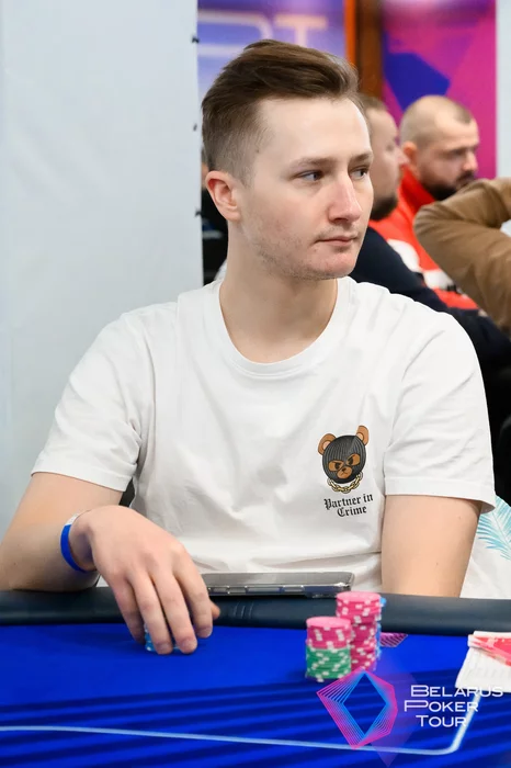 15 место досталось Виталию Олексину. Префлоп он поколлил 3-бет от Курило Евгения. На флопе выехали на все фишки: Курило с , Олексин с .