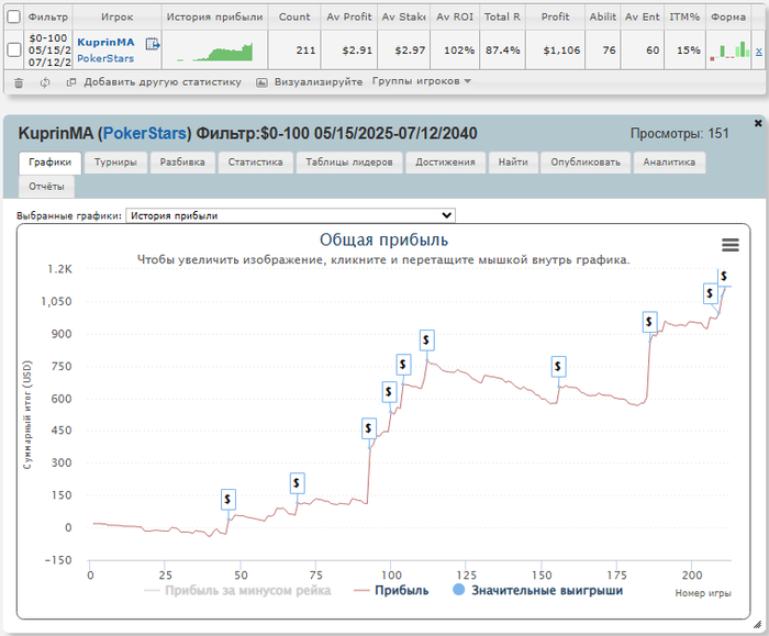 Подводя покерные итоги 2025 года могу сказать, что этот неполный покерный год оказался для меня вполне успешным. Особенно если учитывать все вводные. Приехав в Беларусь совершенно спонтанно, без копейки личных денег, взяв первый раз за 33 года своей жизни кредитную карту и сделав депозит всего 20$, начиная играть с самых дешёвых SnG за 0.25$, к концу года за тысячу турниров на ABI 5$ удалось сделать профит более 12 000$ с ROI 127%, но почти половина из этого ушла бэкеру. Признаюсь честно, в декабре ещё произошёл очень неприятный форс-мажор, в результате которого мой БР сильно просел, но об этой ситуации напишу отдельный пост в ближайшее время.