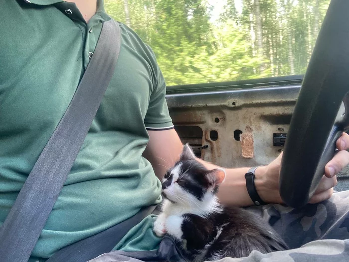 Когда мы с Масей возвращались из Брянска в Добруш, машина снова сломалась. В этот раз я уже ночевал на трассе не один, а с маленьким котёнком. Немного переживал за неё, но она вела себя абсолютно спокойно, даже игралась, когда мы уже стояли на месте. Однако эта история со счастливым концом. Я верю, что эта поломка произошла неслучайно, как и наша встреча с Машей, когда мы нашли Масю, мяукающей в кустах. Всё дело в том, что когда уже совсем стемнело, я услышал мяуканье. Естественно, первым делом я подумал, что это мяукает Мася, но когда подошёл к машине, она спокойно спала. В этот момент я взял телефон и включил фонарик, и в темноте на обочине на свету увидел кошачьи глаза, которые от фонарика было хорошо видно. Маленький котёнок мяукал, но потихоньку шёл в мою сторону. Я был в шоке, так как в радиусе 50+ км не было ни одной жилой постройки. Как я уже понял позже, котёнка просто привезли и выкинули на обочину на верную смерть. И не смотря на и так не самое приятное положение, я понял, что его любой ценой нужно забирать. Здесь на обочине вдали от цивилизации он обречён. Пытаясь подойти поближе к нему, он сразу начинал убегать. В этот момент я вспомнил, что в машине есть Масянин корм и переноска. И нам очень повезло, что в машине оказалась переноска. Взяв корм и переноску, я пошёл ловить котёнка на обочине. Рассыпав корм, я сделал две неудачные попытки его поймать, т.к. он был очень испуган и сразу убегал, но я понимал, что оставлять его здесь - это будет означать его верную смерть в ближайшие дни или часы. Поэтому с третьей попытки мне удалось его схватить и закинуть в переноску. В этот момент он заголосил таким истошным криком, какого я никогда не слышал. Видимо, пережив уже одно предательство он подумал, что сейчас его просто убьют. Мне пришлось в ускоренном темпе делать в переноске отверстия для того, чтобы он не задохнулся. Я стал протыкать её отвёрткой, т.к. времени не было. И в один момент переноска треснула, но, к счастью, котёнок был сильно напуган и всё-таки не вырывался. В итоге, уже под утро за мной приехали родители. Мы оттащили машину на ближайшую заправку и оставили её там. Как оказалось позже, на долгих 30 дней. Расположение было максимально неудобным, так как машина стояла ~ в 175 км от Брянска и в ~ 100 км от границы с РБ, а за несколько попыток починить машину прямо там на заправке, сделать этого нам не удалось.