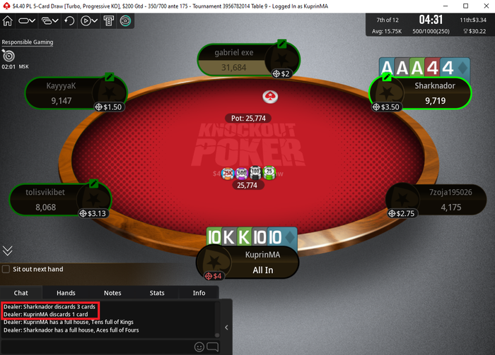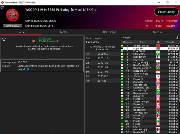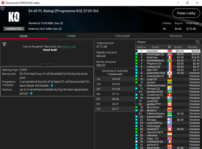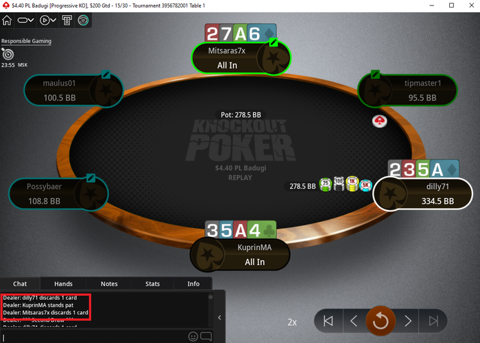 В 22-ых сегодня можно было и четырёхзнак оформить, если бы не переезды. Были обе финалки, но вылетал по классике: финалка бадуги за 22$. Остаётся последний обмен. В банке все фишки. У меня сильная готовая 753А, опп меняет ДВЕ карты и ловит 532А - это второй натс в бадуги. Далеко пойдёт с такой игрой, что тут добавить. В остальных примерно так же вылетал, исключительно в бэдбитах. Это уже даже не придаёт уверенности, а просто стало обыденностью. Уверенность в своей игре в данный момент просто на пике, потому что я кроме бэдбитов вообще никак не вылетаю, ну а результат для меня, как и всегда, значения не имеет. Хотя сегодня я заслуживал большего. Ну и на том спасибо.