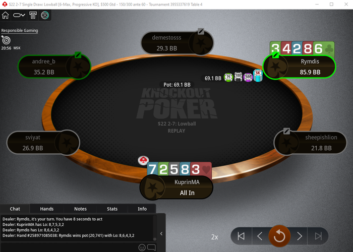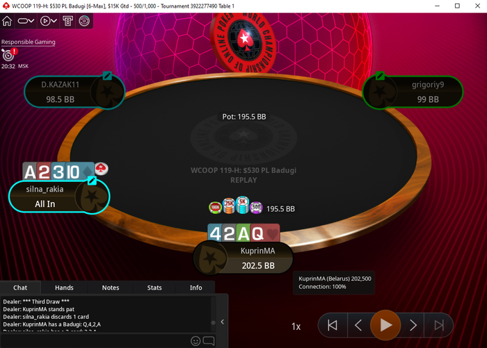 Через пару дней я уже снова сидел в поезде, чтобы вернуться в Беларусь и доиграть два турнира на серии WCOOP. Как сейчас помню, как пешком нёс сумки с компьютером от вокзала до самого дома... Но как оказалось, возвращение было не напрасным. В турнире WCOOP 119-H по PL Badugi за 530$ я оформил свой бесткэш, ну а историю о том, как я оказался в хедз-апе этого турнира со своим бэкером, которого потренировал в бадуги прямо перед стартом турнира, на форуме по праву назвали кинематографичной. А если добавить сюда ещё тот факт, что я предупреждал бэкера о том, что в этом турнире самыми сильными будем я и D.KAZAK11, то наш 3-мах, в котором остались именно мы, только подтверждает мою правоту.
