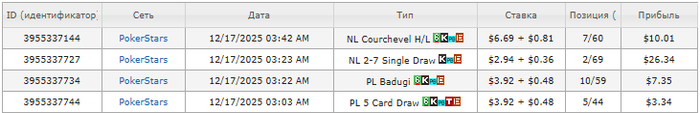 Очень радует, что старзы добавили по пятницам и субботам турниры по моим профильным дисциплинам с бай-ином 22$. Здесь хоть ~500$+ за первое можно выиграть. И теперь ещё подключаю воскресный 5-карт дро за 27$. Так что скоро уже наверно можно будет переезжать в раздел повыше, но всё равно игры мало, поэтому лоу лимиты продолжать играть нужно в любом случае.