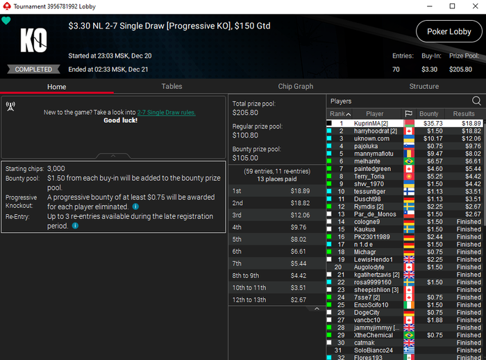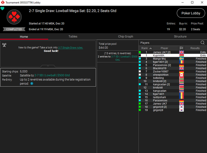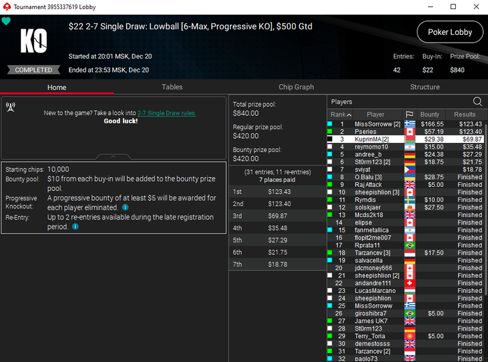 Вечером тоже удалось хорошо поработать. Сделал ещё три финалки и выиграл лоуболл. Всего за день получилось 6 финалок и 4 первых места. В лоуболл по 22$, на который я выиграл оба сата, занял 3. Эти турниры по 22$ у меня так же неплохо идут, но тут важно занимать именно первое, чтобы был приличный буст к БРу, но как есть. Опять же, даже несмотря на такие результаты, переезжали меня сегодня так, что волосы бы дыбом вставали, если бы я неправильно реагировал на эти бэдбиты. На прямом баббле в 5-карт дро человек меняет ТРИ карты, когда у меня сет TTТKх, который после обмена превратился в фулл-хаус, и показывает на шоудауне фулл ААА44... В бадуги сдают готовую 543А - это примерно как стрит-флеш в холдеме. В банке 280 бб. И снова умудряюсь вылететь. Человек наменял 532А... В лоуболл по 22$ вылетаю 87532 < 86432... Но опять же, как говорил ранее. Если я вылетаю только в таких дичайших раздачах, значит по-другому переиграть меня сложно. Ну и результаты тому подтверждение. Думал 23 числа уже ехать домой, но сейчас просто каждую сессию печатаю $, поэтому чувствую, что нужно остаться ещё хотя бы на недельку. Ну а сейчас нужно немного поспать перед воскресной сессией и снова за работу! 💪
