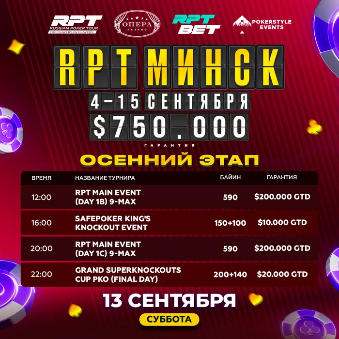 💎 В 12:00 и в 20:00 сыграем ещё два входных дня $590 RPT MAIN EVENT ($200 000 GTD). В дне 1В сыграют 16 уровней по 30 минут, в 1С — 16 уровней по 20 минут. Регистрация будет открыта в обоих флайта до последней минуты игры.