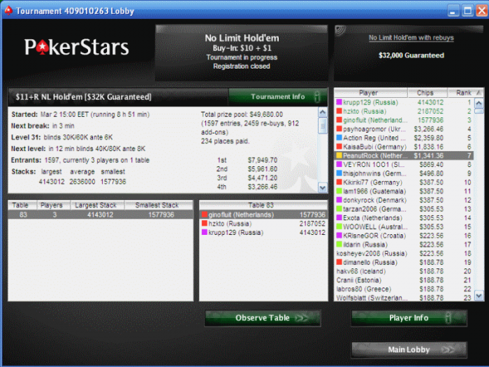 Ну чтож товарищи в этом месяце я выполнил две цели.это отыграл 1098 турниров и затащил сандеймульон чтохочеться секазать я рад.Но чувства удовлетворености все равно нет потомучто чувствую что недобрал где то около 5 штук баксов,а это годовая зарплата чиновника из верхней палаты законоадтельного собрания Украины.