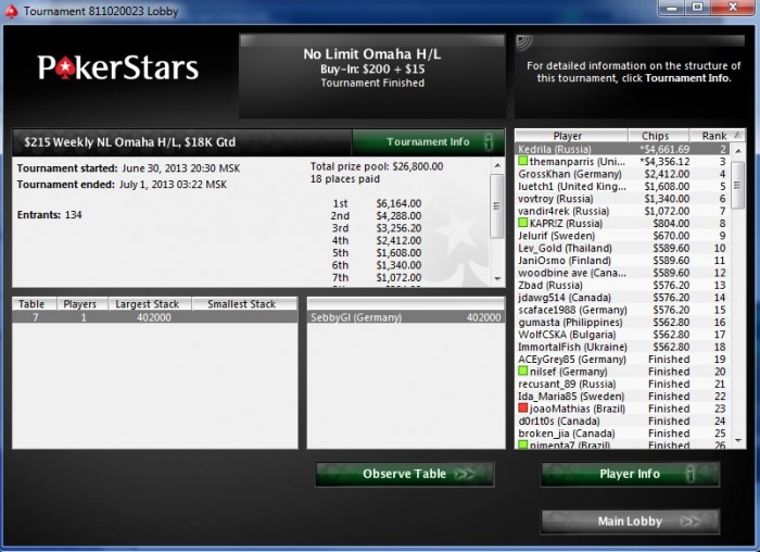 В топ 3 поделили поровну. Играли только за путевку. Играл как истинный онлайн про без единого блефа) короче, за топ 1 не сильно расстроился, тк визы в сша все равно нет. Всем огромное спасибо за ауру, жалко во время турика нельзя было посмотреть все эти сообщения в VK и блоге, мне правда очень приятно, что за меня болели.