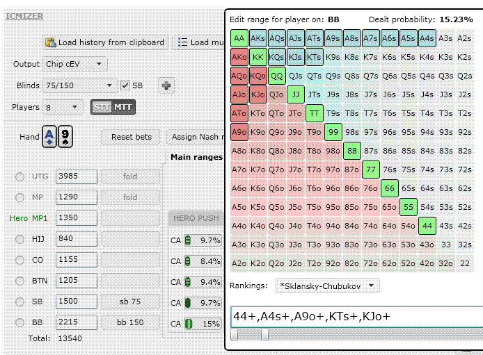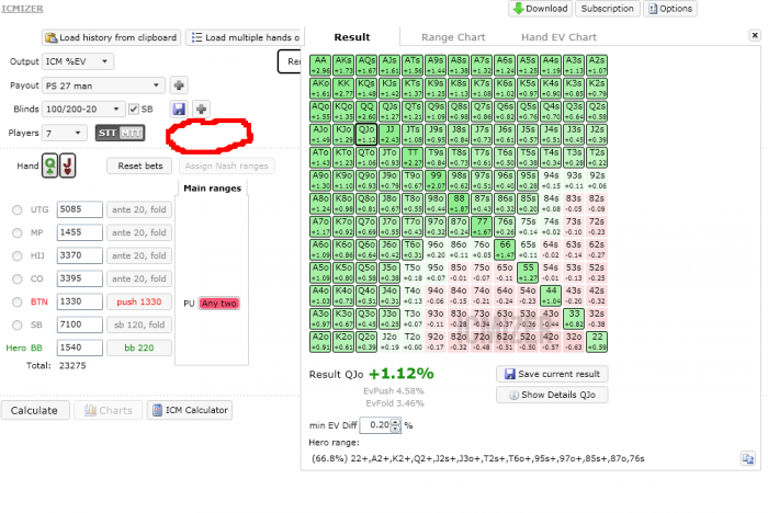 И по поводу терминологии, математическое ожидание или EV, обычно применяется к случайной величине, и тут понятно, что это такое. Пуш или фолд, это действие, однозначного понимание, проще сказать однозначной терминологии, что такое матожидание действия нет, в частности, что в покерной литературе, статьях и тп. легко можно встретить разные трактовки. Проведи опрос общественного мнения на этом форуме, чему равно EV фолда в фишках со средней позиции без анте. Я уверен, что существенная часть скажет, что 0. (Потому что неоднократно встречал эту терминологию на форуме и в статьях, вот пример (http://www.pokeroff.ru/Bettr/pot-oddsy-tvoju-mat-post-2888743))