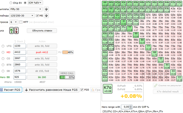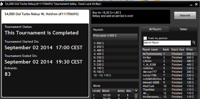 BB kutasek10 (6,382) 16bb Blinds: 200/400 Ante 50