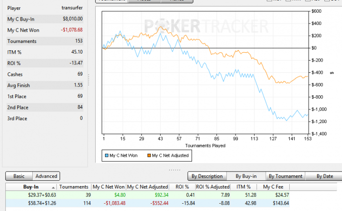 Выкладывался сегодня по полной программе. Завтра перед очередной сессией буду сидеть анализировать игру за сегодня. Не буду говорить, что сдавали плохо. Но на постфлопе ошибок было немного. Небольшой анализ я проводил после 100 турнира. По большей части были кулера.
