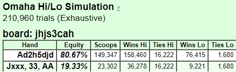 Пара вопросов по раздаче: тут она в блоге https://forum.gipsyteam.ru/index.php?viewtopic=140246&st=240&gopid=6060971&#entry6060971 1) Префлоп стоит ли с такой рукой нырять? 2) Есть ли колл по флопу? Ниже мои расчеты, но я незнаю, может я вообще все не так считаю PokerStars, $1.96 + $0.24 - Omaha H/L Pot Limit - 600/1,200 - 6 players Replay this hand on Upswing Poker