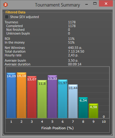 ХМ2 неправильно считает. ЕВ считается как для стандартных снг 50/30/20 с байином 14,10+0,9. Оно очевидно будет завышено, т.к турнирные доли рассчитываются не правильно. Разработчики считают что эти турниры не популярны и не собираются как то по другому рассчитывать в них ЕВ. Поэтому в ХМ2 ЕВ совершенно точно не соответствует действительности).