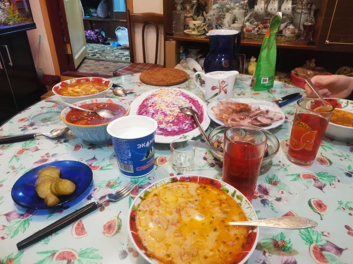 Тётя Тоня как обычно наготовила как на праздник! Все очень вкусное, сытное, трудно всего не покушать! Капуста, грибы, огурцы, помидоры, салаты, картоха с мясом и грибным соусом, сало, грудинка, колбаса, сыр-и все добавки подкладывают)) Ещё и студень был!