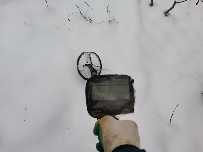 Ни одной монетки((немного цветнины и чернушка! На горках снега 10см- в низина 20-25!трудно мелкую цель выхватить!
