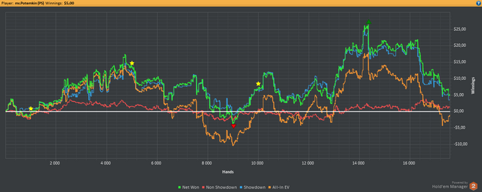 06.02.17 я внес депозит на Старзы и начал играть два стола NL2 SH Zoom. Примерно за месяц я отыграл чуть более 17к рук. За это время результат составил +$5 (1bb/100)