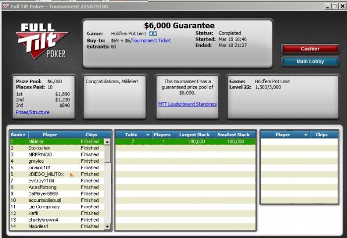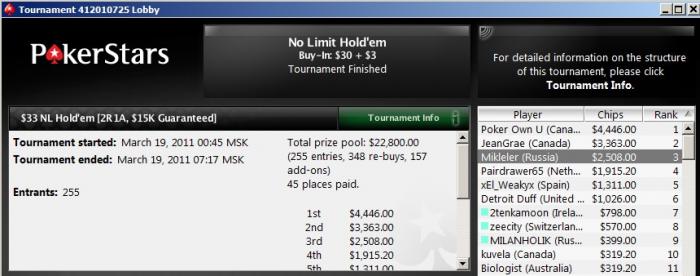Старзы - все равно лучший и любимый рум. Увы, не дотащил неплохой турик. В ТОП-3 бился 2,5 часа с двумя канадцами. К сожалению, не удалось выйти в ХА. Принял пуш от мб на и проиграл его , а следом он же меня выбил с против . Но достойные оппы, у обоих под 300к профита, так что интересная игра была. Правда, догоняли фишки до среднего стека 14М.