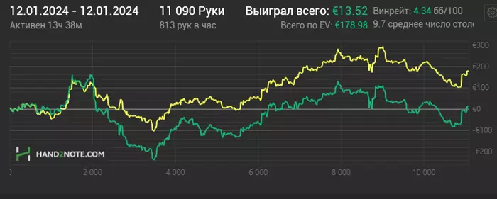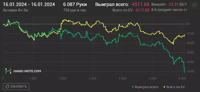 Ireful, судя по твоим дистанциям за день+у тебя рук в час 850 это много столов+3максы+5максы+рейк нагрузка на нл20-50 просто дикая на венике,получается что играть в хороший плюс маловероятно и диспа лютая из-за небольшого винрейта