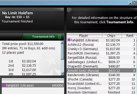 В топ-4 50р в 3бет-поте сб в бб 2й в 1й стэк сдали флеш во флеш со флопа( еще 4й в 20р омахе 6-макс, 5й в 30р 6-максе, баббл в 100р 6-максе (сет перекупили раннер флешом и я заплатил :( ) и 12й по 109 на 888. Правда день "всего" в +3к, но в плюс - не в минус, как говорится. )