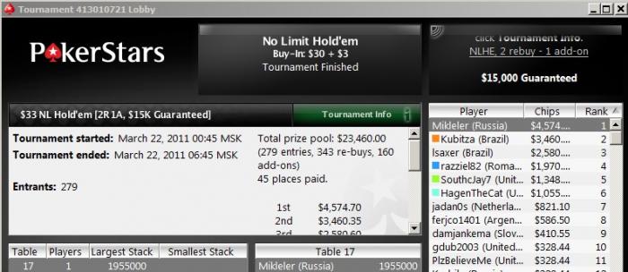А вот в турике на ПС 33-2р-1а все шло куда интереснее. Все время я играл со средним стеком, пока не вышел на финалку. Там был один хороший рег и интересный бразилец Кубица - слабый по ОПР, но играющий очень лузово и очень прилично. В общем, на финалке мне было комфортно, хотя и, единожды выставившись в койнфлип, монетку проиграл. Если дня 3 назад я играл топ-3 с двумя канадцами, то на этот раз в соперники достались 2 бразильца. Кубица посильнее, второй - послабее. У второго я фишки и забирал, но потом они сошлись в оллине - и Кубица выиграл. В ХА он вышел с перевесом раза в 1,5. Но ХА я всегда выигрываю. Поначалу у него тактика была проста: на практически каждый мой рейз ставить оллин. Но потом мы все же сыграли постфлоп - и эта раздача стала ключевой: