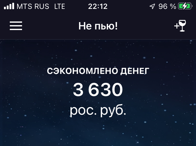 Предлагаю поставить в приложении расход на алкоголь в день согласно среднему потреблению в сентябрь - 250 рублей).3600 рублей за 6 дней конечно греют душу, но никакого отношения к правде не имеют. А так будешь плюс-минус понимать сколько действительно сэкономил.