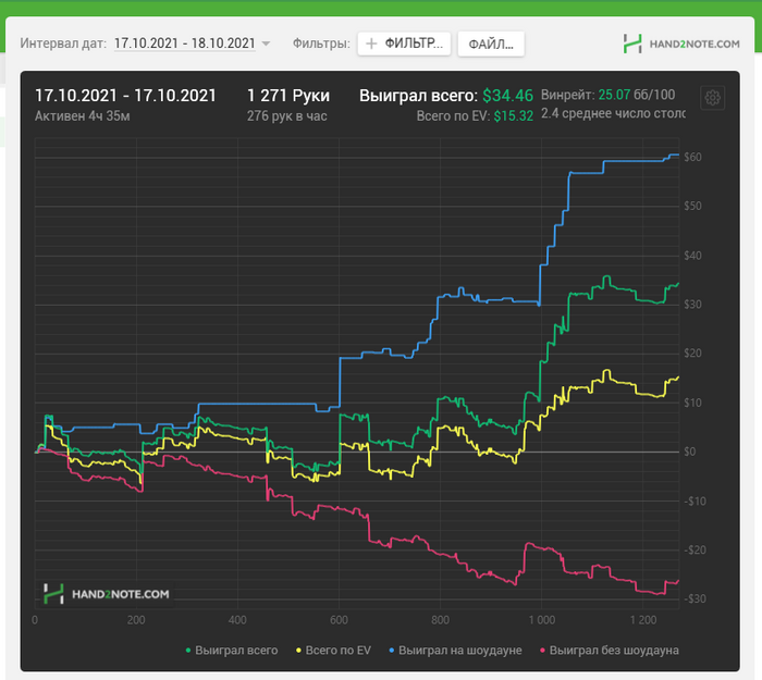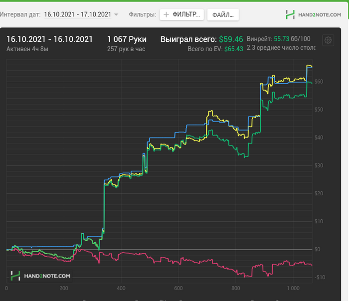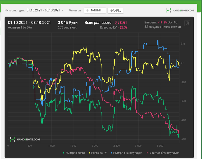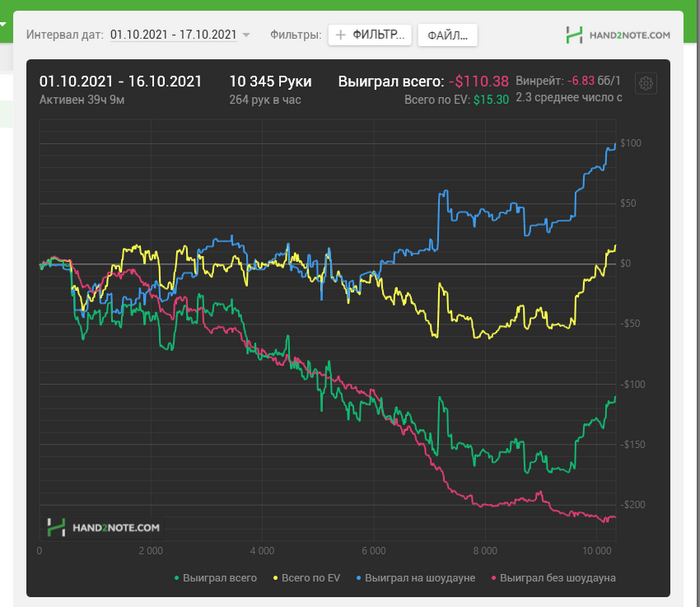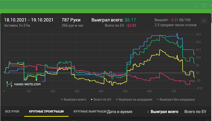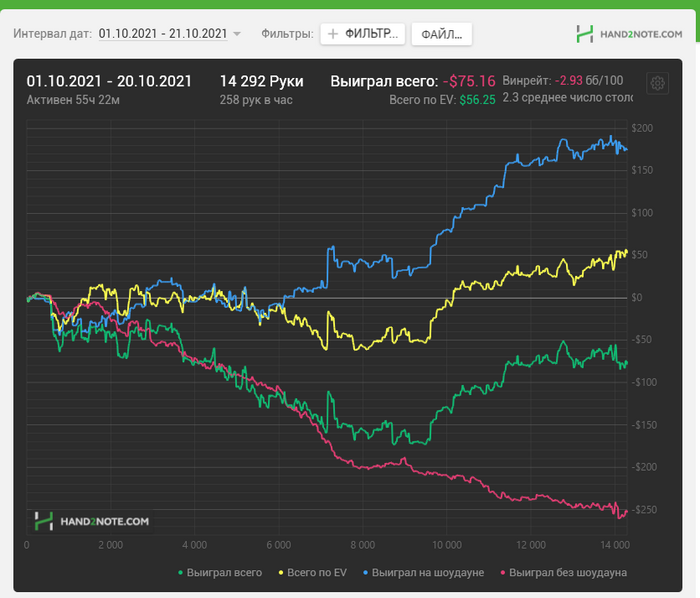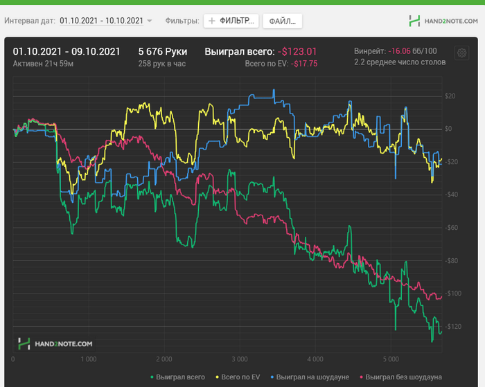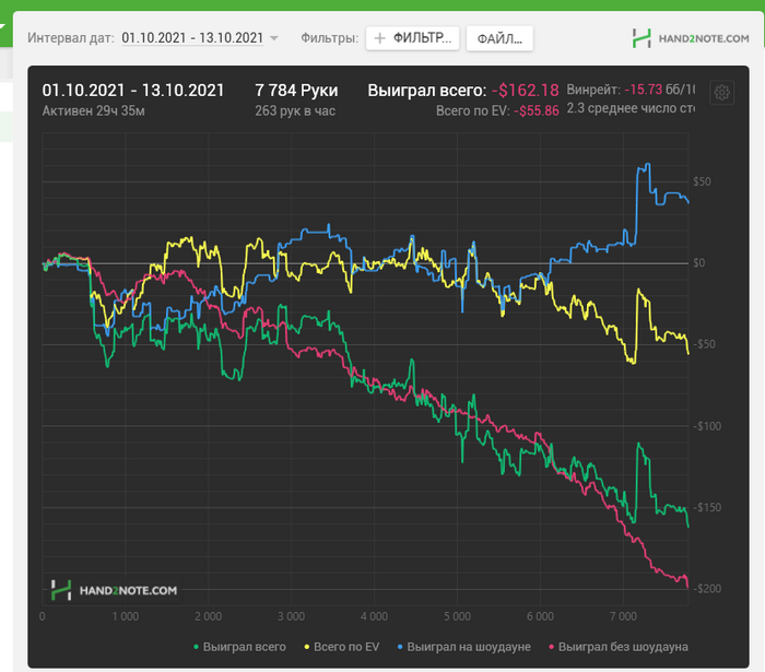 Посмотрел сейчас всю дистанцию по базе, оказывается уже 65к рук играю в 0: