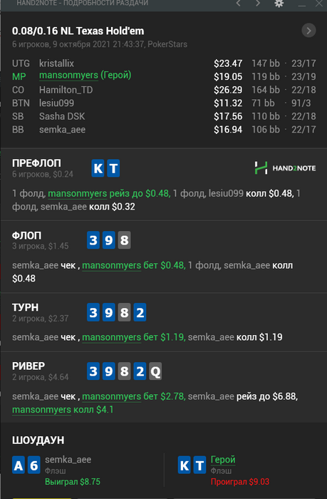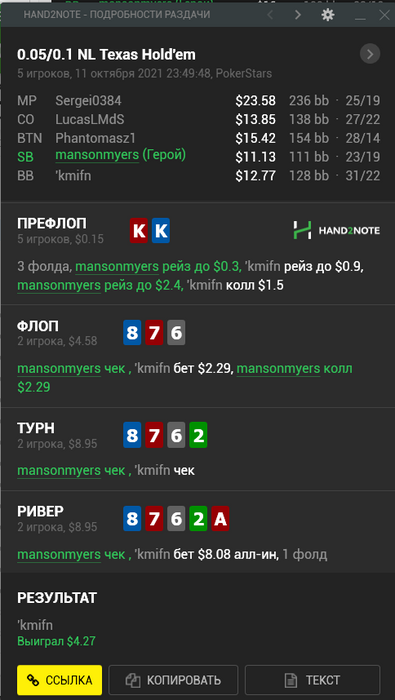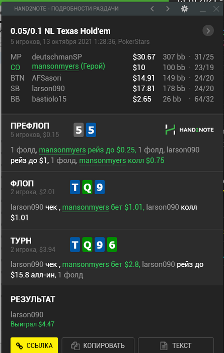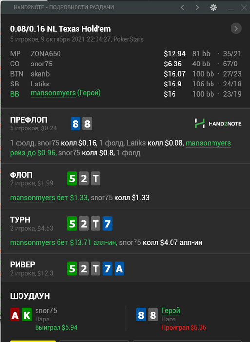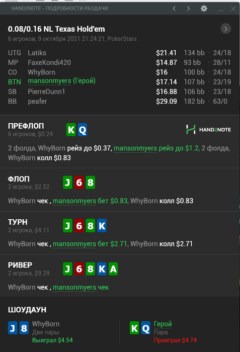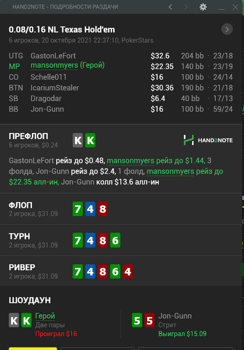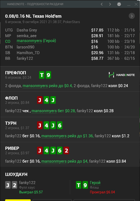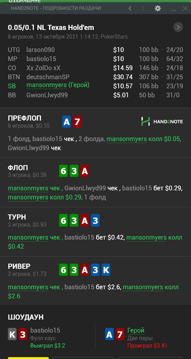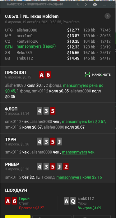 Тут фиш выйгрыш после рейза 30%, я хер знает как тут упасть, понятное дело минрейз всегда это хуево от фиша, но мне кажется еще и вс короткого не отскочить, но судя по стате последние 500 рук у него пассивная игра