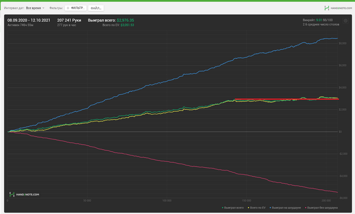 Конечно, имея 207к рук дистанцию я не могу точно сказать какой у меня винрейт, но думаю уж на нл10-16 при низкодисповой игре могу рассчитывать на 7-8бб хотя бы, но просто сам факт что я попал примерно в 5% стрик это пизда..