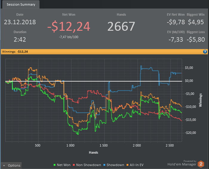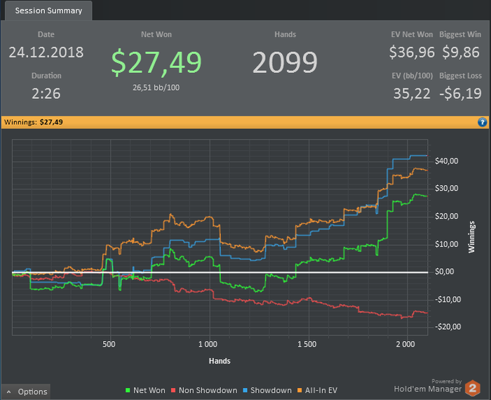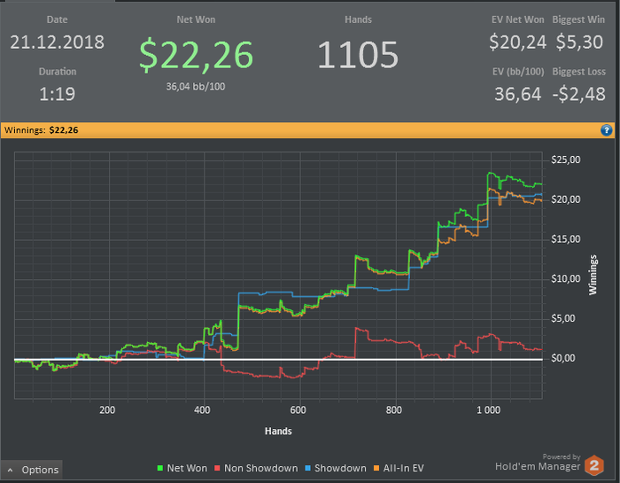 Вот я каждый раз реально сам с себя удивляюсь. Почему я не могу к каждой сессии подходить так серьёзно как к этой? Сделал все по фэншую, разогрев (повторил ренджи в ФЗ, почитал заметки по своей страте, посмотрел ошибки прошлой сессии) Взял лист бумаги и накидал себе план на сессию, что обязательно игра должна быть осозннаной,с максимальным селектом(минимум фиш с впип 45+) без выхода за рендж, не обращать внимание на переезды, не смотреть кассу, играть не больше 1,5ч , не воевать с регами. Строго соблюдал все пункты, особое внимание уделял прошлым ошибкам. И вот оно чудо, все заиграло совсем по другому.
