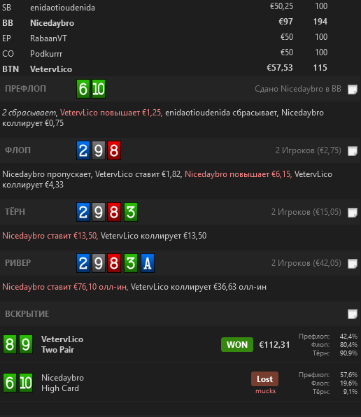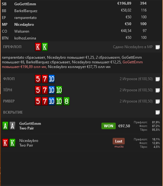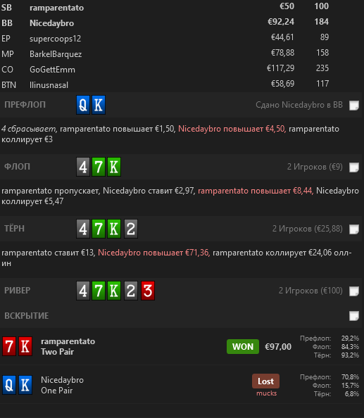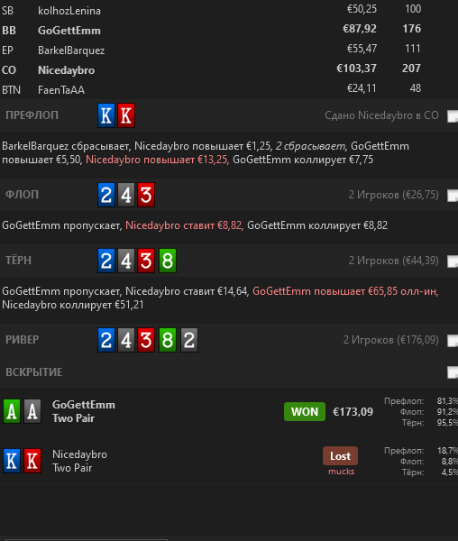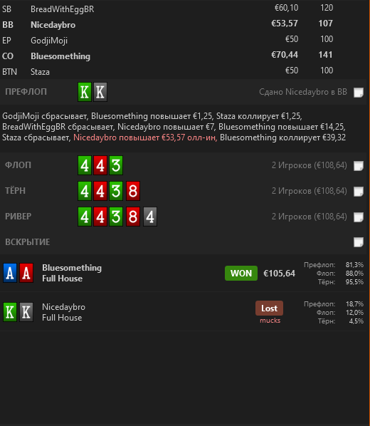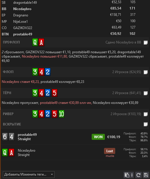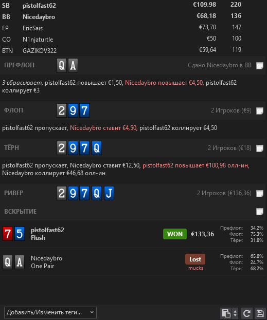 Больно, отфиксирую ничью сегодня с ред старом. Мне тоже справедливости ради ништяки раздавали до этого, но чёт так сконцентрировано напихали в конце, бомбанул)) закончу пораньше сегодня, а то я ещё успел вот такую сыграть раздачу))прям намёк что пора идти отдыхать))