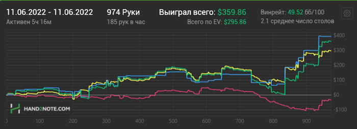 Я уже упоминал, что с осени прошлого года до конца весны нынешнего года я значительно снизил требования к селекту, а также углубился в разбор раздач и работу над игрой против регов. И знаете, что это мне дало помимо мнимого ощущения превосходства, когда я вижу у оппонента не тот сайзинг не с той рукой не на том борде? Да ничего, я просто месил глину в 0 полгода и конкретно от игрового процесса получал значительно меньше удовольствия, т.к. в совокупности с худшим думсвич раном в моей карьере это превратилось в игру на выживание длинною в несколько месяцев.