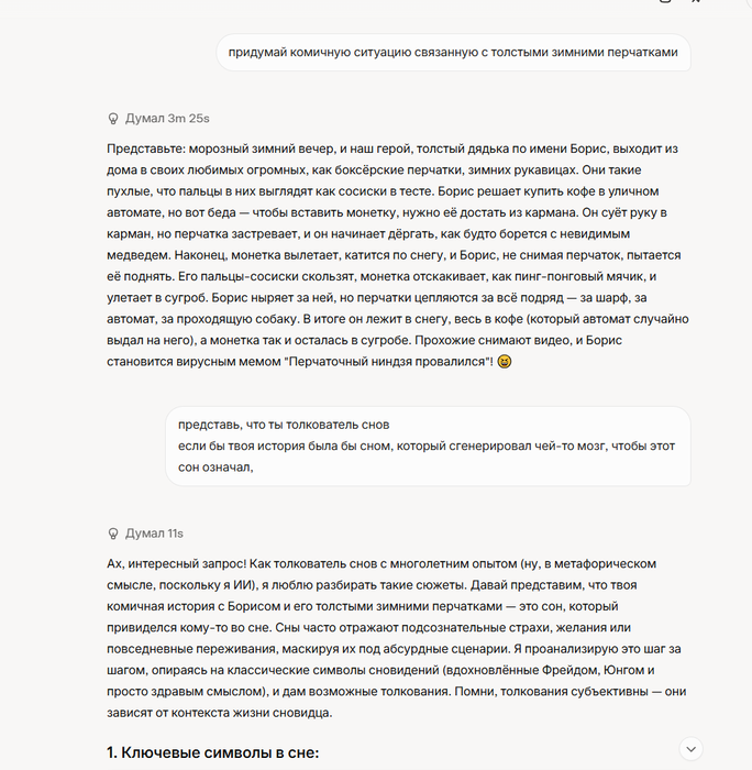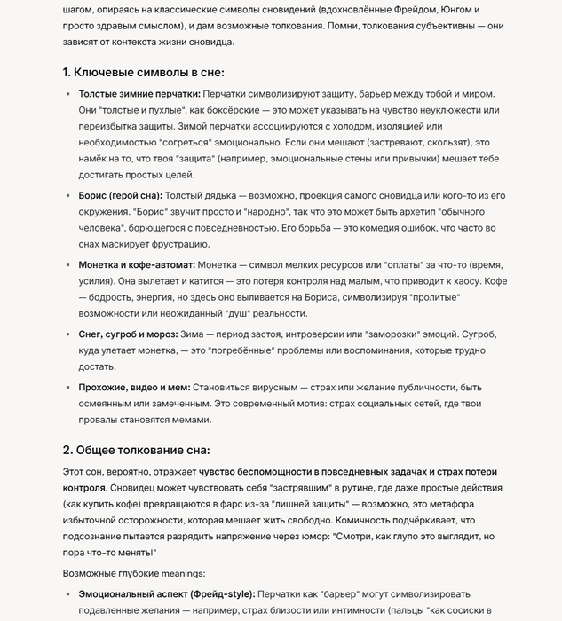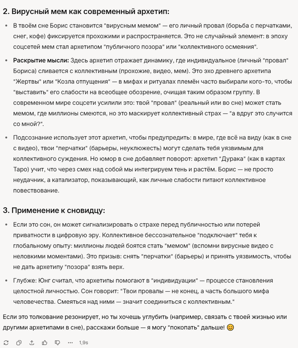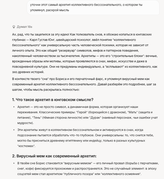 Мысль мне очень понравилась, и мне стало интересно, если дать ИИ запрос, чтобы он представил себе комичную ситуацию с толстыми перчатками, насколько его галлюцинации будут похожи на мой сон. Его ответ меня поразил. А дальше я попросил ИИ представить, что он является толкователем снов, и чтобы он проанализировал и истолковал ту историю, которую он мне рассказал с точки зрения толкователя снов. И я ахуел. Правда не совсем понял сначала его юнговкусю трактовку, тк я долгое время теорию архетипов сам обмозговывал, и я мне показалось что он на отъебись просто ответил. И я попросил его уточнить, и в очередной раз я прихерел.