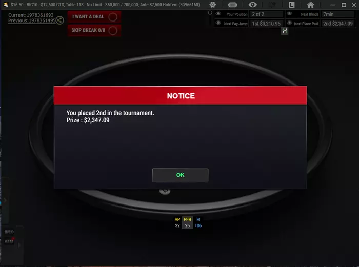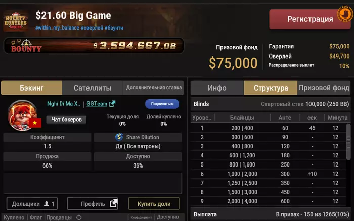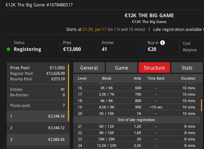 Общее количество фишек в турнире = 69 500 000. Исходя из собственного опыта, ИТМ на редстаре наступает спустя 45-60 минут после окончения лейт реги. Вот тут уже данные, которые я не могу никак подтвердить, посчитал по чуйке. Если бы я знал, что мне придется писать этот пост, то играя на редстаре, засёк бы время в нескольких турнирах, когда бы входил в зону ИТМ и выявил среднее.